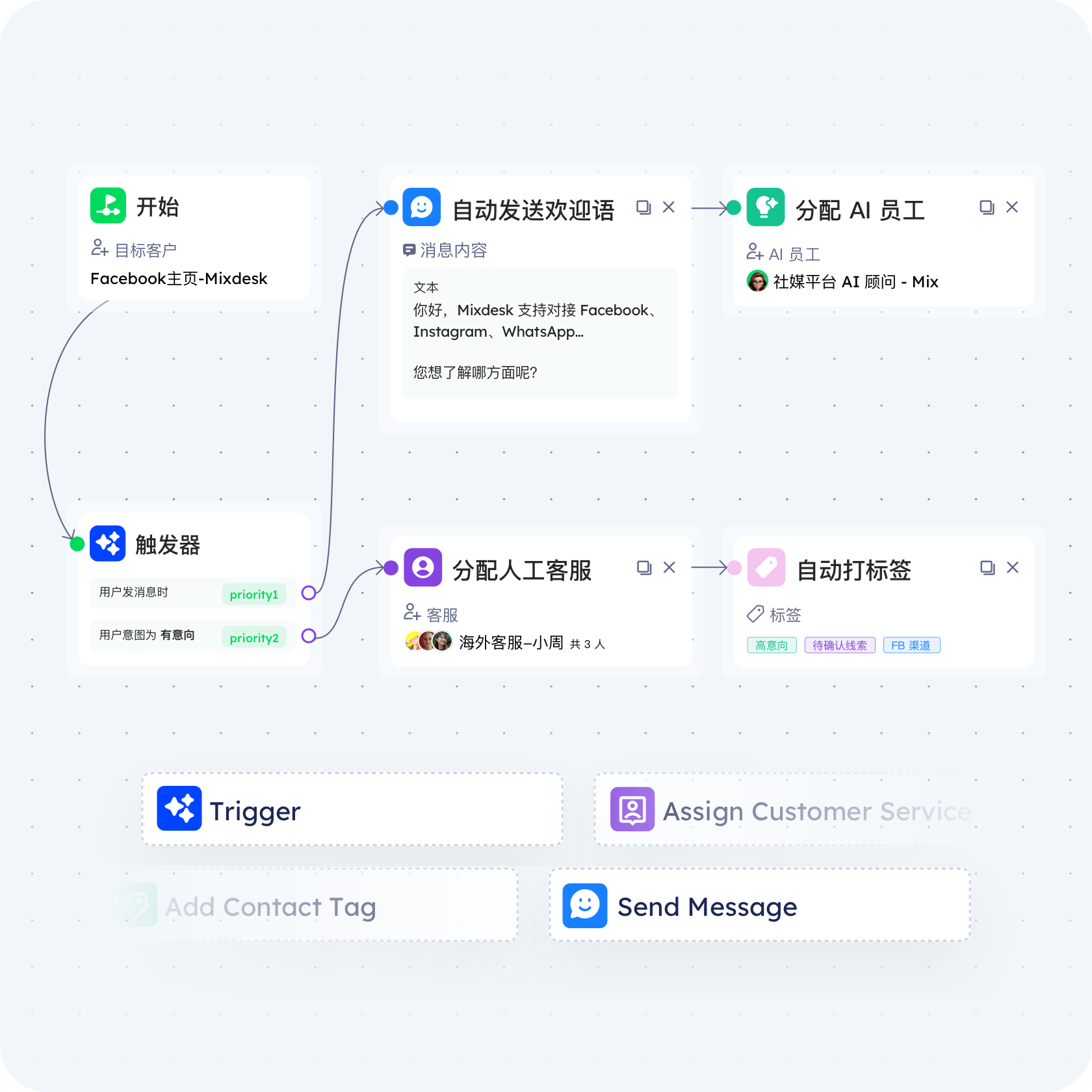 用户进线后的第一刻是建立互动和转化的关键,Mixdesk 通过 AI 与自动化工作流结合,实现高效用户引导: