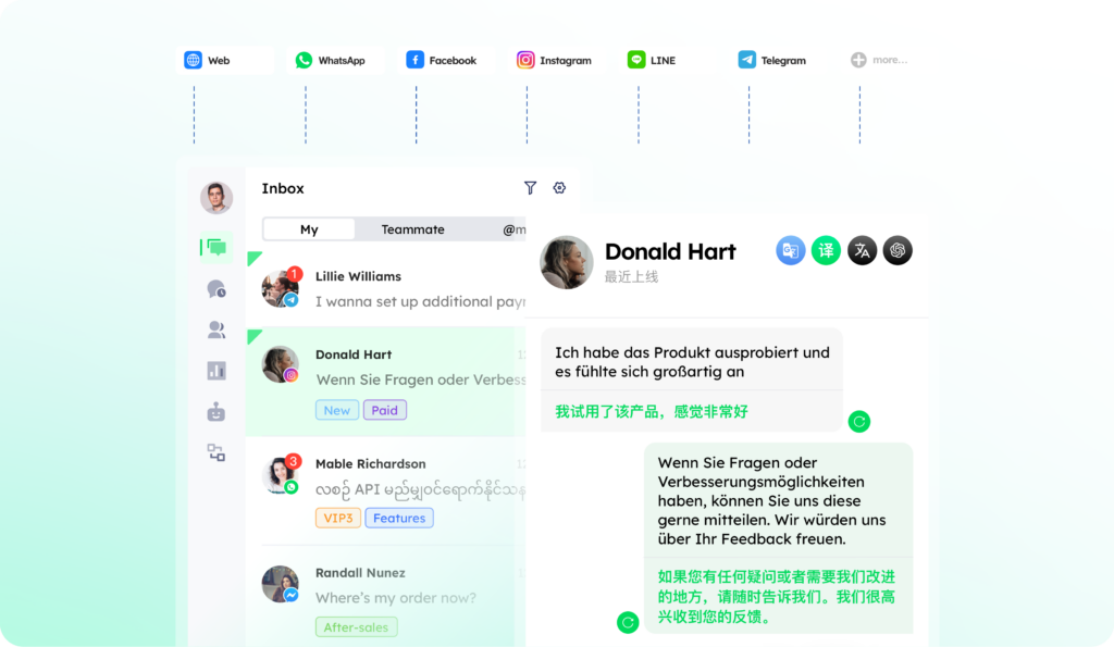 - 统一消息中心:无论客户从哪个渠道发起咨询,消息都会自动汇总。