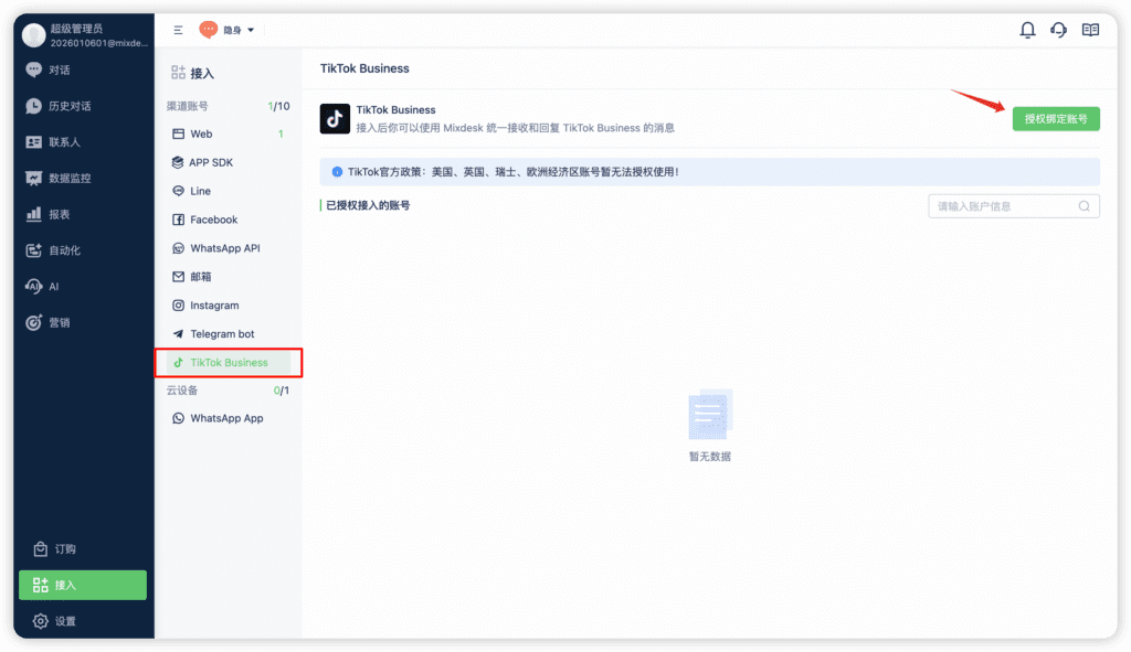 登陆Mixdesk系统后,在左侧导航栏点击「接入」,在选项中选择「TikTok Business」渠道,点击右上角的「授权绑定账号」