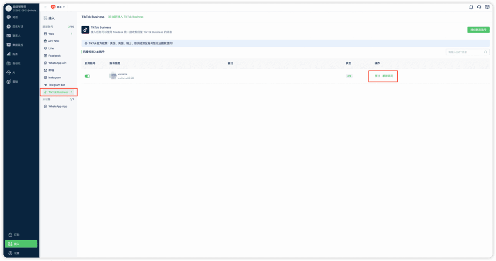 绑定成功后,你可以返回Mixdesk工作台,在「渠道接入」中查看TikTok Business 账号的绑定状态,你也可以进行新增账号备注和解绑操作。