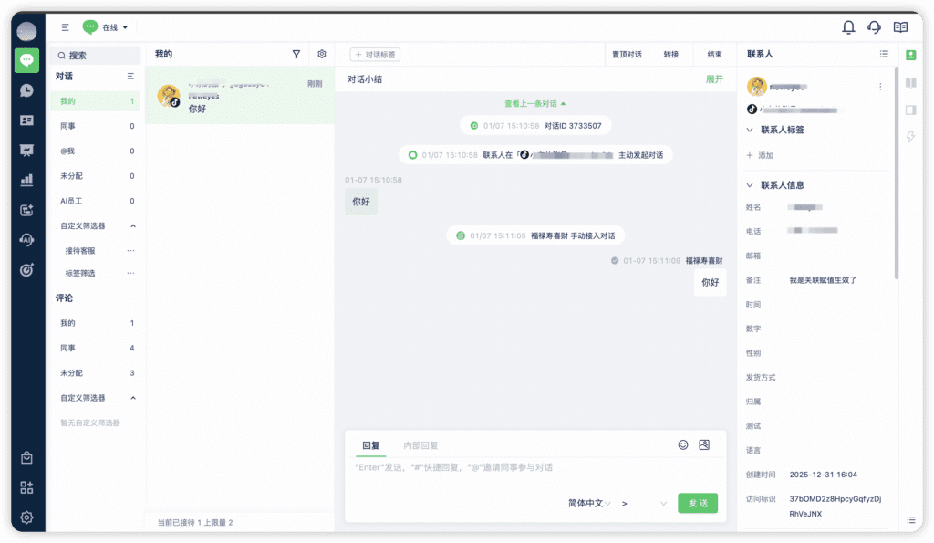 在Mixdesk工作台绑定成功后,可以接收和回复TikTok Business账号的用户消息