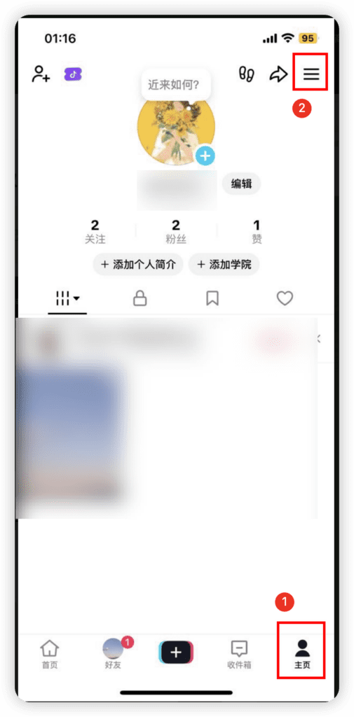 登录您的TikTok账户,点击主页 -》点击右上角的「设置」: