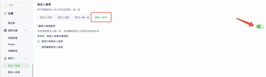 Mixdesk 支持自动合并同一联系人,你可以选择合并规则,合并后自动使用老联系人的信息,还是使用最新联系人的信息。