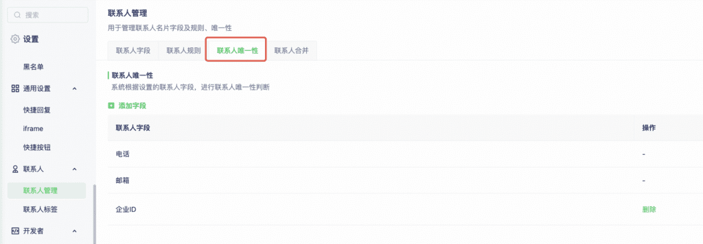 自定义添加的联系人唯一性字段可以进行删除,但不会影响之前已经判断生效的联系人信息。