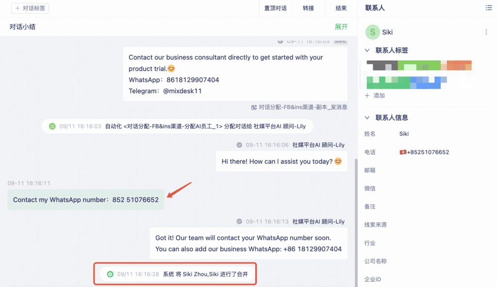 我选择的自动合并规则是「使用已有联系人信息」。当用户之前已经通过WhatsApp渠道进入过咨询了,Mixdesk系统已经自动存储了用户电话号码;后续用户的 Facebook 账号从 Mixdesk 系统绑定的 Facebook 主页进入咨询,并发送的自己的电话号码,系统自动抓取并识别到为同一号码,进行了自动合并。