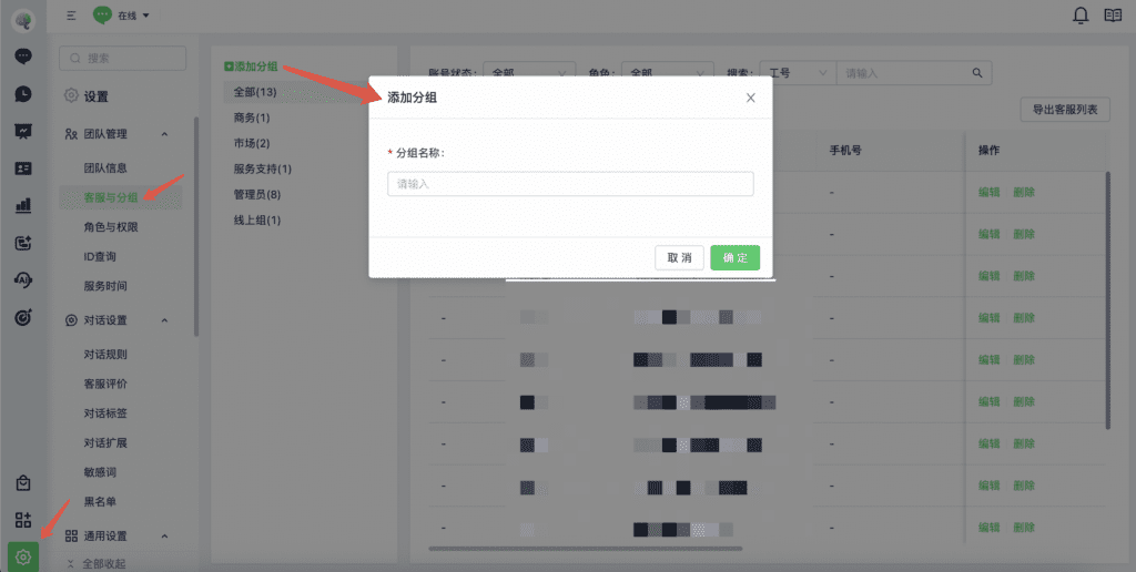 进入「设置」-「客服与分组」,点击「添加分组」,输入分组名称,点击「确定」