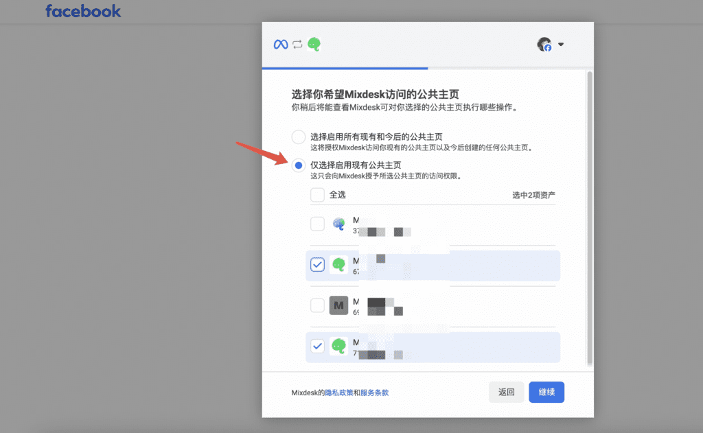 ① 选择需要授权绑定的Facebook公共主页,然后点「继续」下一步