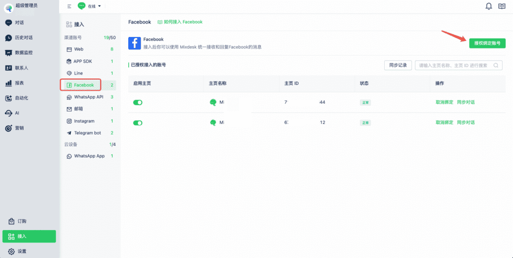 登陆Mixdesk系统后,在左侧导航栏点击「接入」,在选项中选择「Facebook」渠道,点击右上角的「授权绑定账号」
