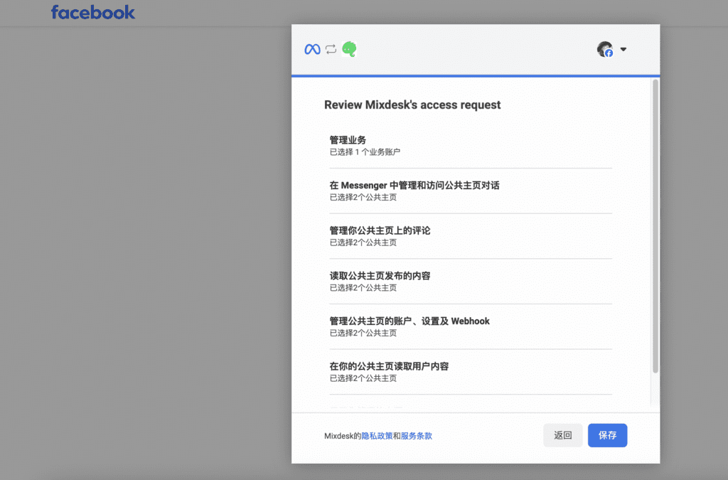 ③ 查看授予Mixdesk系统的权限,然后点「继续」下一步