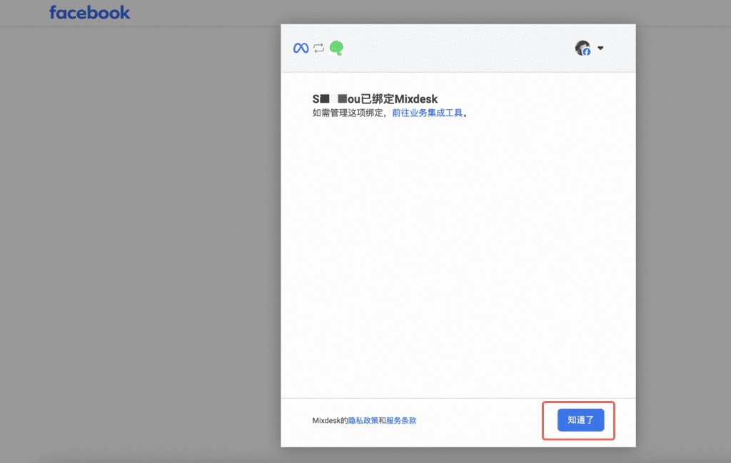 ④ 绑定成功后,页面会提示 XXX (Facebook账号名称)已绑定Mixdesk,点击「知道了」,即可返回Mixdesk渠道接入页面。