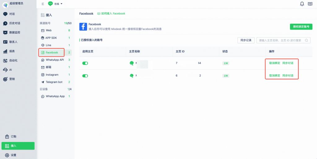 公共主页绑定成功后,你可以返回Mixdesk工作台,在「渠道接入」中查看Facebook公共主页的绑定状态。