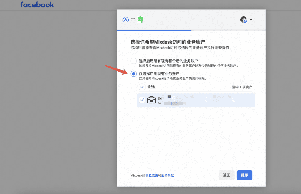 ② 选择「仅选择启用现有业务账户」,然后点「继续」下一步
