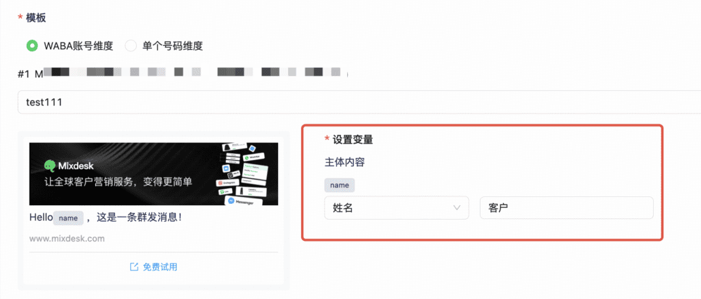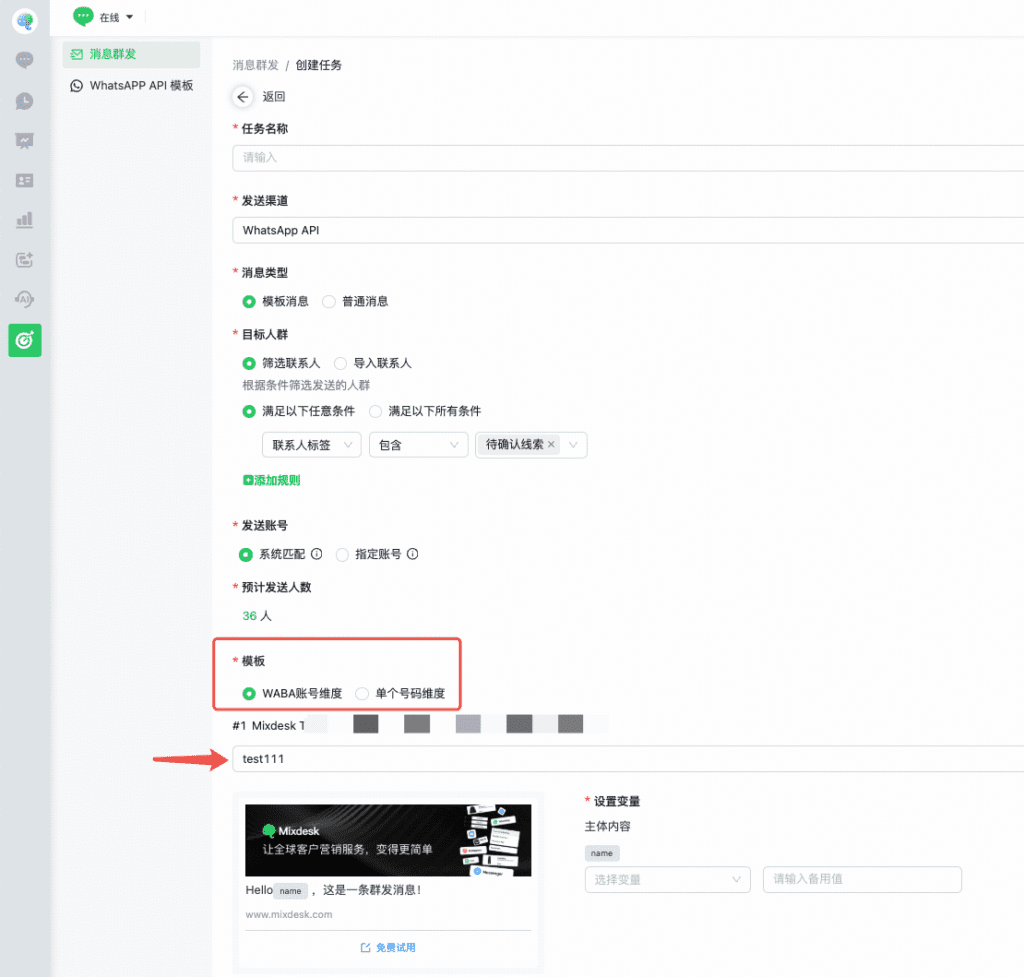 ④ 模板,选择【WABA账号维度】即发送账号都用同一个模板,【单个号码维度】则可以每个号码选择不同的模板。