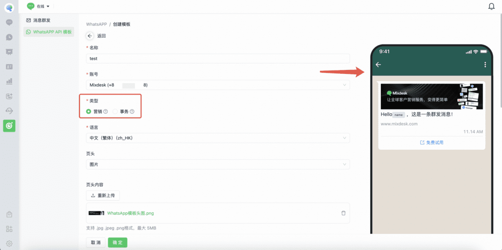 ③ 类型:选择群发内容对应的类型,营销类的群发消息 或 事务通知类的群发消息。❗️注意按实际内容选择,否则模板会审核不通过。