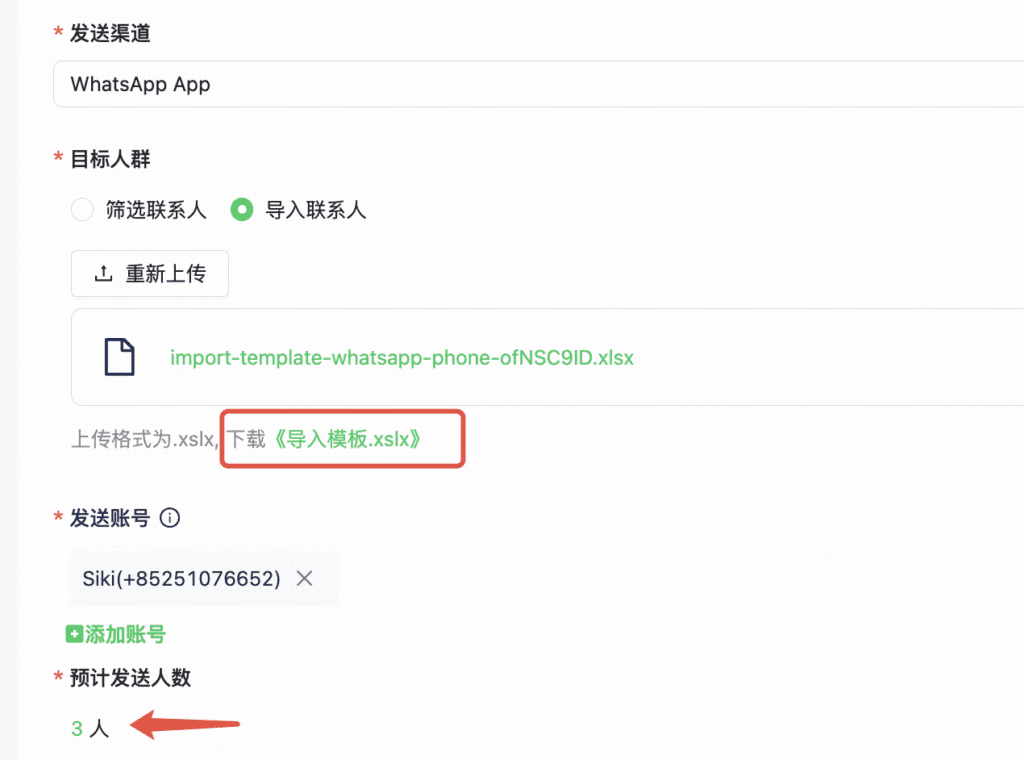 ② 数据整理好后,上传数据,导入成功后,下面会自动显示导入数据中的预计发送人数。