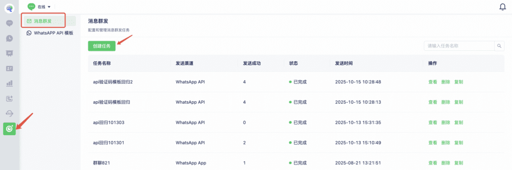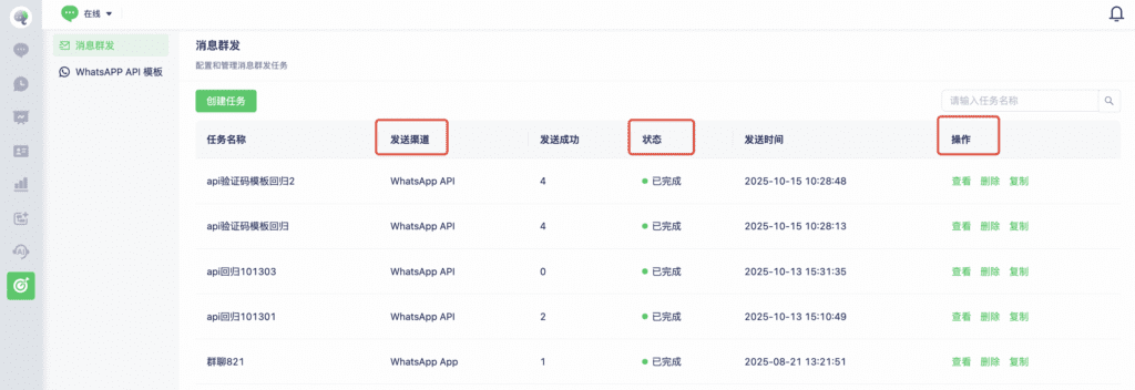 群发任务创建好之后,可以进行【暂停or继续执行】、【查看】、【删除】、【复制】等操作。