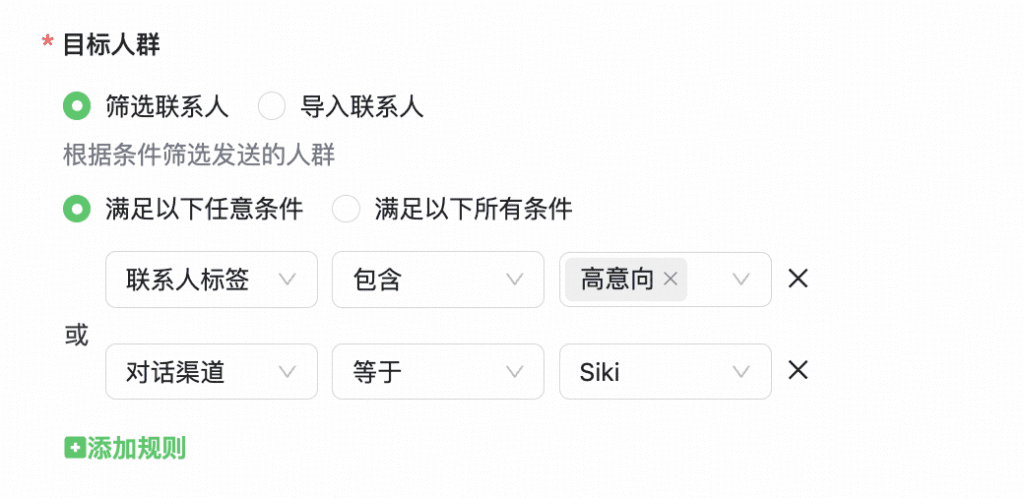 ❗️【满足以下任意条件】:筛选的客户满足任意一个条件,就会全部群发。【或】条件