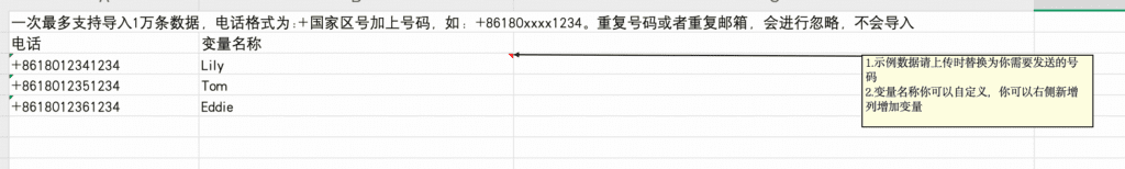 ① 下载「导入模板」,根据模板要求填写联系人手机号码,如果设置了变量,请一并填写。