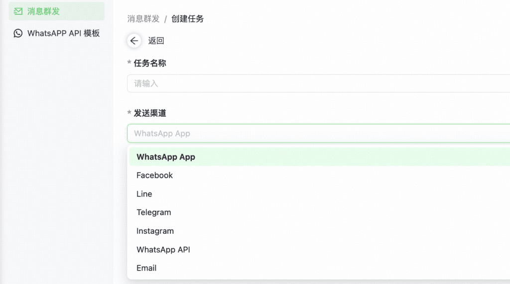 ① 任务名称:填写群发任务名称,方便内部查看分辨任务。