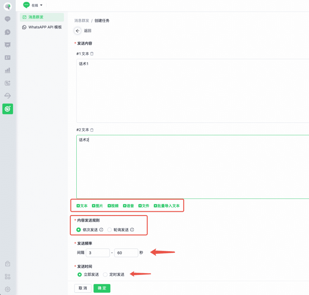 群发内容支持发送文本、图片、视频、语音、文件等多种消息类型,还支持批量导入文本内容哦~